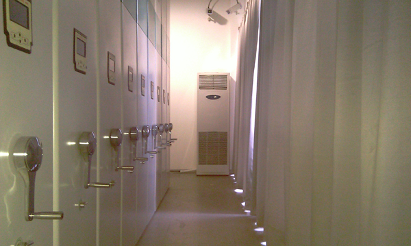由于是大學檔案館,檔案資料比較多,庫房內均使用的是電子式密集架。我公司技術人員在除濕機安裝位置到選擇方面先后數次于館方工作人員進行確認,勁量達到極不影響檔案庫房內格局的美觀同時又保證了除濕機正常工作時空氣循環的問題。