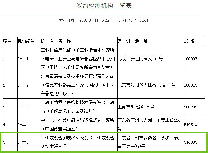 4. 表中第5位,機(jī)構(gòu)編號(hào):C-005 為 廣州威凱檢測(cè)技術(shù)研究院 資料。