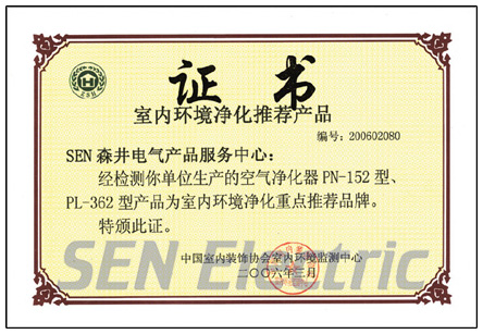 SEN 森井高效專業空氣凈化器榮獲“中國室內環境監測中心重點推薦品牌”榮譽 |